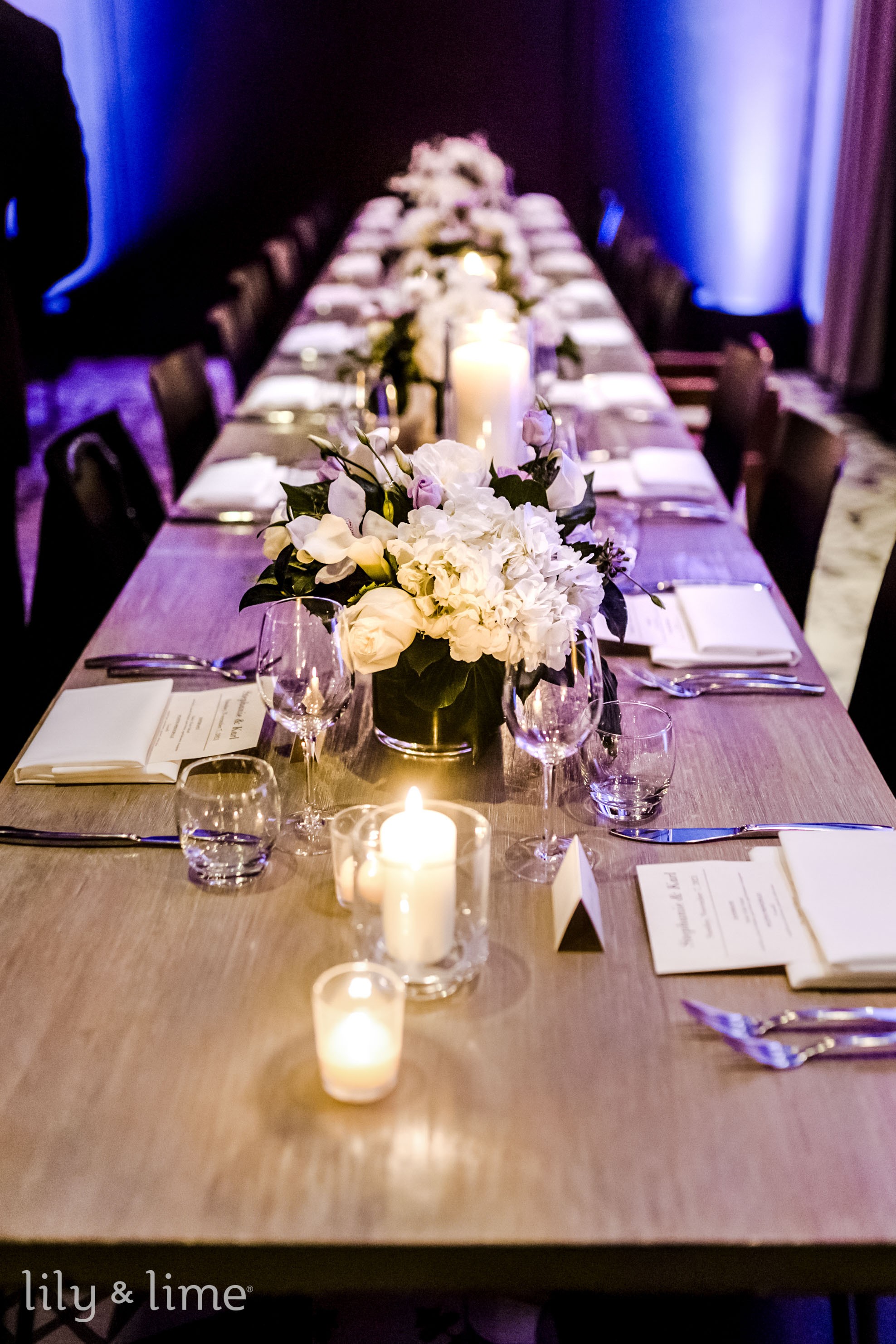 Taking your centerpieces off the table and suspending them above can transform your space entirely. Hanging wedding décor arrangements of white blooms create a stunning visual effect and free up valuable table space, making your reception look and feel more open and airy.