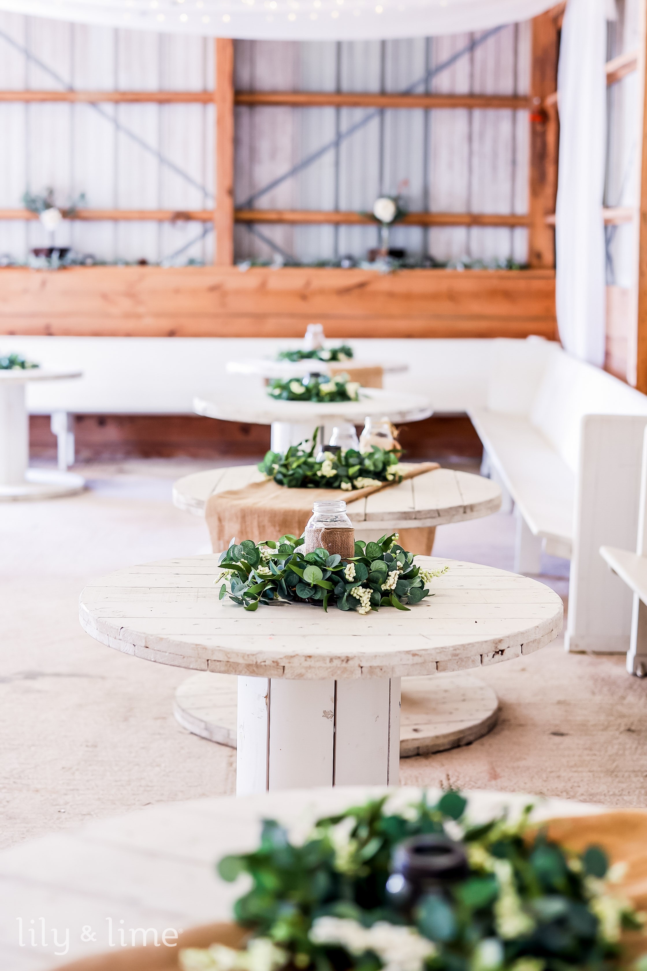 White wedding lantern centerpieces surrounded by a wreath of flowers and greenery bring a rustic yet chic vibe to your wedding décor. This idea is particularly great for outdoor or barn weddings, where the lanterns’ soft glow complements the natural surroundings, creating a cozy, intimate atmosphere.