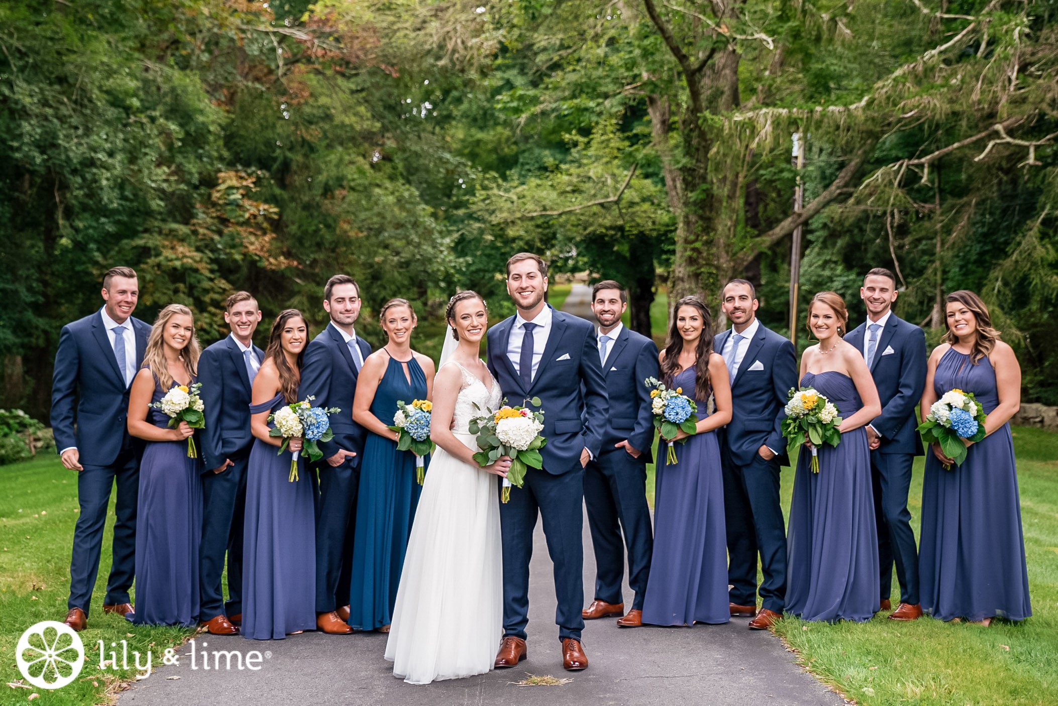 The wedding day started off with the lovely couple getting ready for the exciting day ahead. Jennifer and her bridesmaids were dressed in matching getting-ready outfits which consisted of blue shorts and white tank tops, perfect for the warm weather. Jennifer soon changed into her wedding gown, a gorgeous A-line dress with a delicate V-neck, a swooping back, and a lovely floaty tulle skirt. She wore her hair in an intricate braided updo, adorned with a sparkly hair accessory, and the pretty veil completed her look beautifully. Her makeup was minimal and neutral and jewelry consisted of a pair of classic pearl studs and her wedding ring. A gathering of mismatched flowers in white, pink, yellow, and blue, along with a lacing of foliage made her bridal bouquet, which completed her wedding ensemble beautifully. The bridesmaids were wearing beautiful blue bridesmaid dresses, and carried assorted bouquets in a similar color palette as the bride, all looking stunning! David looked just as perfect in his classic blue suit paired with a white shirt, blue tie, and white pocket squares. He wore a white floral boutonniere to complete his look and accessories with tan formal shoes. His groomsmen wore matching suits but paired them with powder blue neckties instead of true blue, and the effect of the wedding party turnaround was impressive, to say the least.