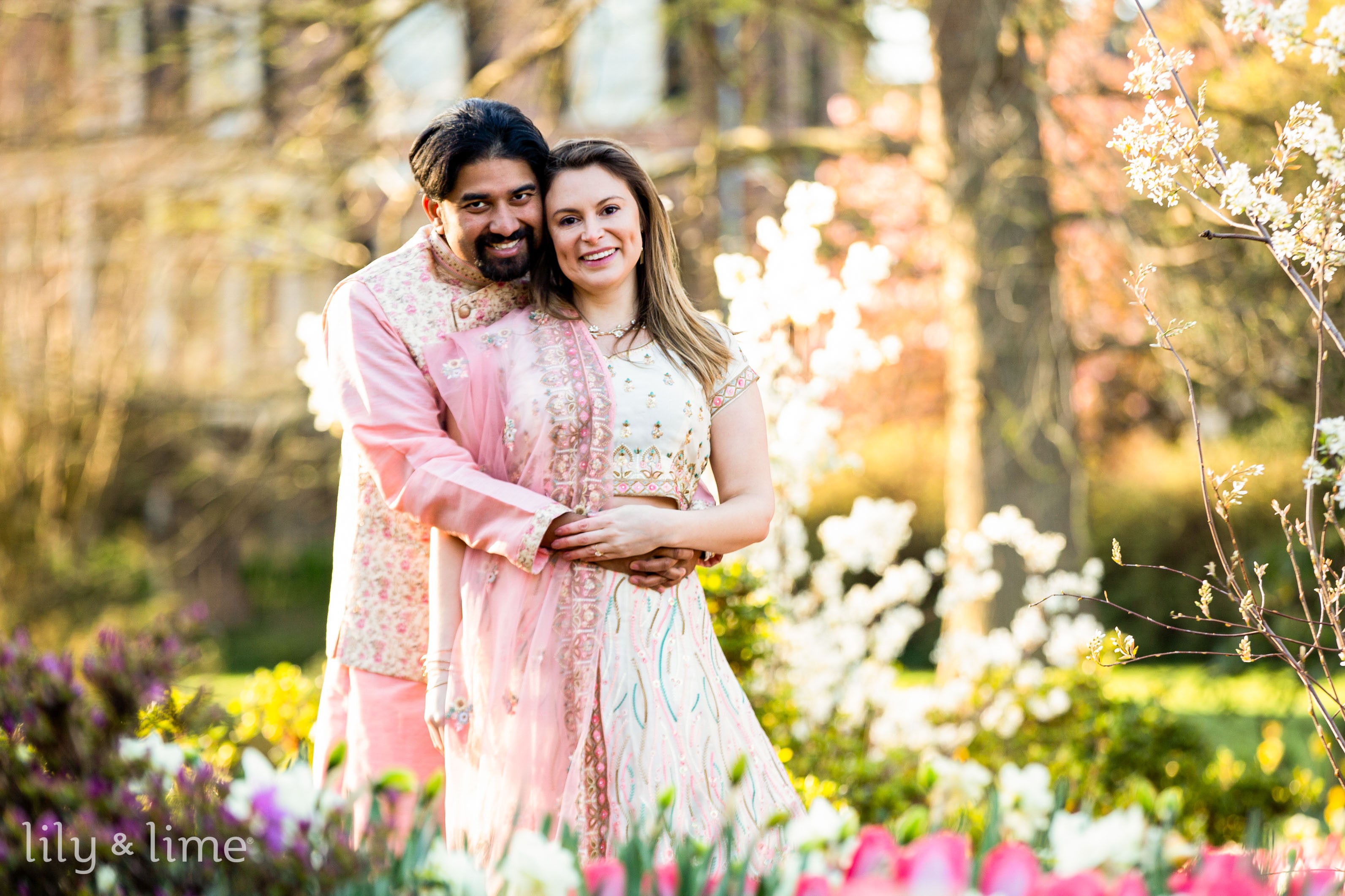 Abhik and Sally’s outdoor engagement photoshoot was a breathtaking blend of love, culture, and the vivid vibrancy of nature. Set against the lush tapestry of a flower-filled garden, their session unfolded like a fairy tale written in blooms and tender glances. The day began with the garden cloaked in the soft, golden light of early morning, casting a serene glow over the myriad of flowers that awaited the couple. Abhik and Sally arrived, looking nothing short of royal in their South Asian attire, their excitement palpable in the crisp morning air. Sally, adorned in a cream lehenga with exquisite pink embroidery and embellishments, looked ethereal. Her pink dupatta fluttered gently in the breeze, a perfect complement to her delicate jewelry and soft, open-flowing hair styled with light engagement makeup. Abhik, her fitting counterpart, wore a pink kurta paired with white pajama pants, over which he draped a floral ethnic jacket, mirroring the garden's bloom.