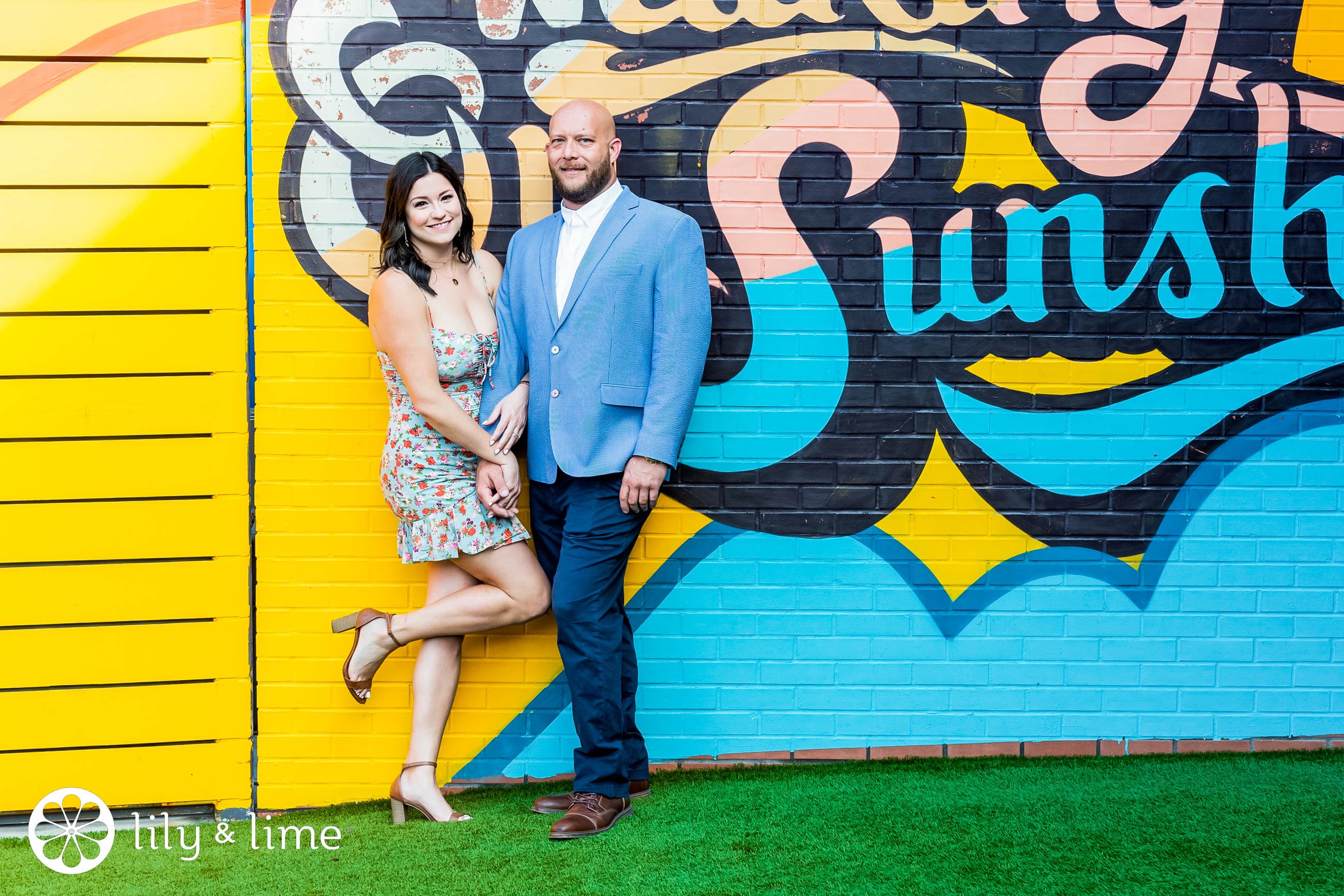 The decision to photograph the couple outside was a fantastic one because the weather was sunny and gorgeous, and the cheery vibes and the colorful backdrops provided the perfect backdrop for the gorgeous engagement photoshoot! This time of year, there is a distinct vibe in the streets, the air crackling with the warm-weather excitement. The graffiti in the backdrop, which was tastefully decorated with colors, the duo toasting to a bright future ahead, and the smiling faces all made for some gorgeous couple photographs. The candid moments captured by the Austin engagement photographer while the pair were facing each other in the outside cafe area turned out to be really cute! The expressions on Alicia's face were priceless and needed to be caught by an experienced photographer, which our Austin engagement photos did brilliantly! We love how the photographer shot some of the photographs as they were lost in each other’s presence, creating some timeless images to hang on the nightstand. While we adore the café shots, we also adore getting a peek of the city of Austin in the background and how the engagement photographer included the city in all its colorful glory. This engagement shoot is overall incredibly touching and joyful, and it makes our hearts happy!