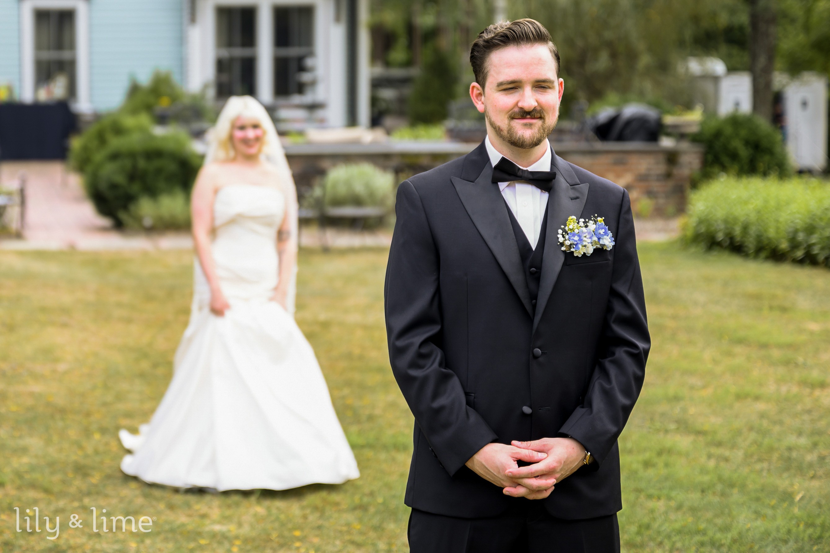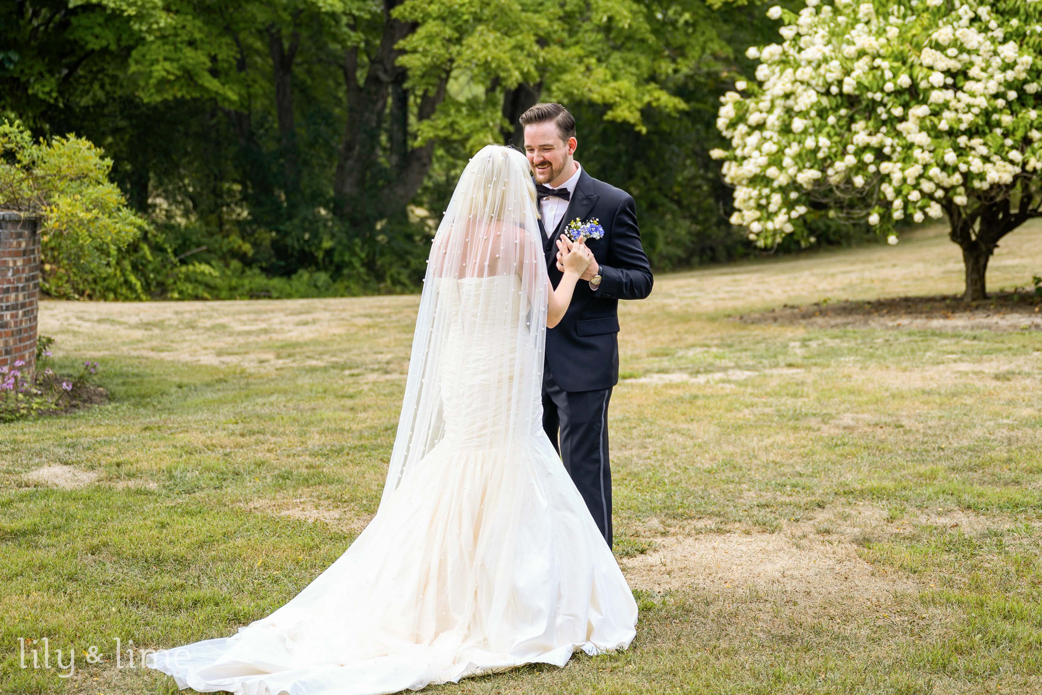 Meanwhile, the girls were getting dressed for the day. Starting their getting ready time with a short chat, they decided to get dressed quickly. The bridesmaids decided to finish dressing up first, and then they helped the bride. As the girls were getting dressed for the day, our photographer took some photos of the wedding dress. Danielle, being a stylish bride, had a short hairstyle, and had decided on a beautiful wedding dress. The bodice of the wedding dress was snatched and had a sweetheart neckline. The skirt for the dress was separate. The ensemble made her look absolutely stunning! As she put on her dress, her bridesmaids and the maid of honor decided to help her with the makeup. Almost looking like the stunning actress, Marilyn Monroe, our bride for the day had bright but elegant cherry red makeup, and paired her wedding dress with a veil! And just like that, our bride was dressed for the day! She made her way to the spot where she and Conrad were to have their first look photo session! Our photographer captured their love and sheer excitement in the first-look photos. Conrad was standing outside, on the lawn, with his back turned. Danielle gingerly walked to him and softly tapped his shoulder. Taken aback by the beauty of his soon-to-be wife, he could not keep his eyes on her. He hugged her, and he could not stop smiling! It was easy to see that the couple could not wait to start their lives together.