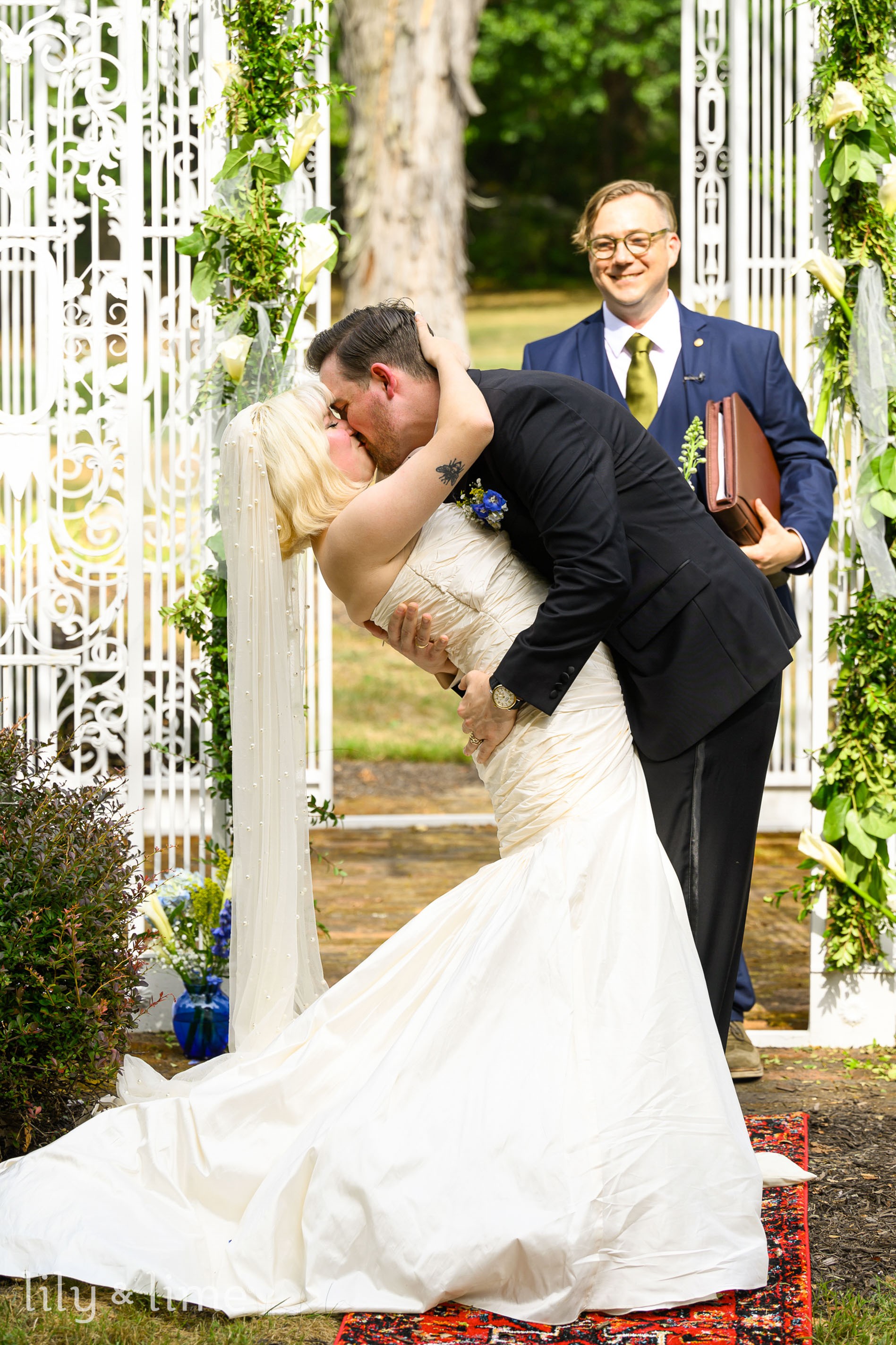 And just like that, it was time for them to tie the knot. Danielle and Conrad had decided to have an outdoor wedding ceremony. And we love outdoorsy weddings, especially brilliantly planned outdoor wedding ceremonies! The couple had decided to transform the beautiful outdoor lawn for a ceremony setting. The seats for wedding guests were arranged, and the wedding aisle was beautifully minimal. The outdoor altar for the ceremony was a wonderful white birdcage-like arbor, which added a lovely detail to the wedding ceremony details. Imagine a tranquil garden, dressed in beautiful white decor details, with pretty accents and an ambiance of love and happiness that was the stage for these two to step onto and tie the knot. The splendor of an outdoor setting not only frames the couple against the backdrop of natural beauty but also offers a sense of space and freedom that indoor venues may struggle to provide. With the sun out, and the day looking absolutely stunning, it was time for the outdoor wedding ceremony. The wedding aisle was simple, decorated only with a beautiful red carpet. The wedding rings were kept on a table surrounded by beautiful blue and purple flowers. For the wedding guests, Danielle and Conrad had decided to choose beautiful white wooden chairs for their wedding guests. And when the wedding guests were seated, they waited for the bride to walk in and walk to the altar. The groom and groomsmen made their way to the wedding altar and waited for the bride to walk down the aisle. Within minutes, Danielle walked in, arm in arm, with her father, and Conrad could not wait for her to reach the altar. The sun was shining, a soft breeze was blowing, and the day was prettier than any other day we’d seen in wedding photos. And soon, Danielle had glided to the altar, and Conrad helped her get up. The wedding ceremony started and the wedding guests looked on in awe. Happy to see the couple take their wedding vows. And just like that, the two were married. The outdoors erupted in claps and joyous congratulations as the newly married couple walked down the aisle together. After the wedding ceremony, Danielle and Conrad smiled and waited for the guests to make their way for photos.