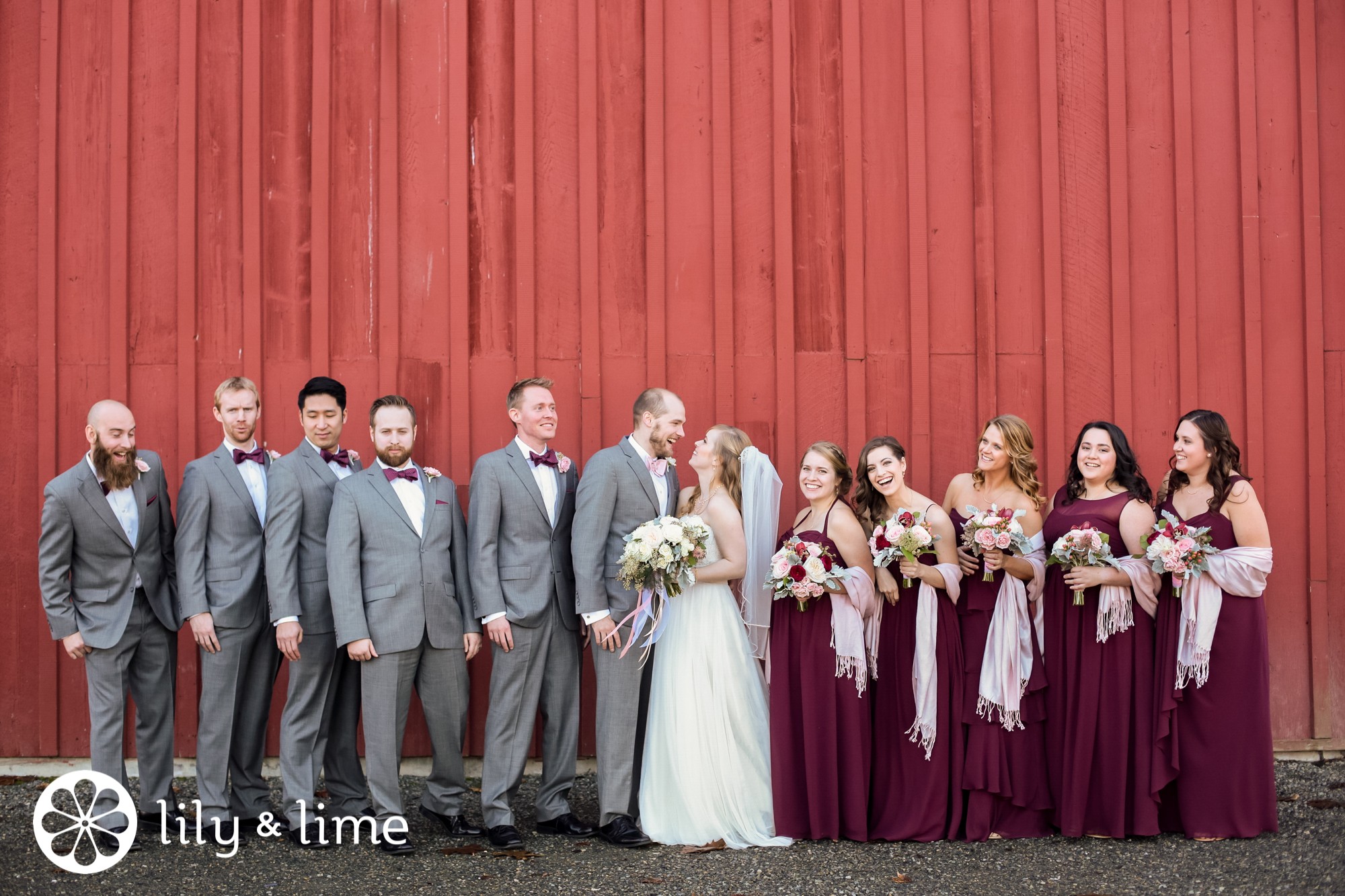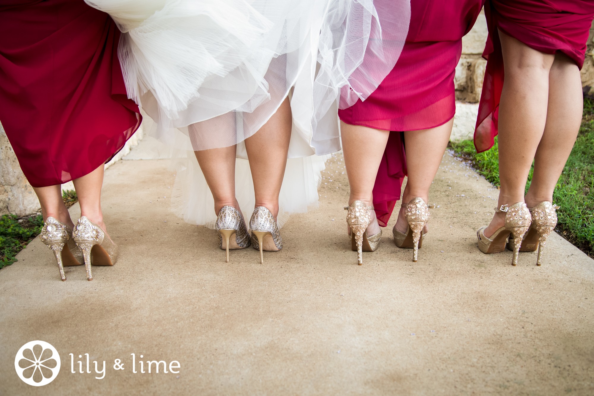 Thanks to the trend towards mix and match bridesmaids gowns, these ladies in red look confident and coordinated without being matchy-matchy. We love the variety of takes on color and theme -- from burgundy pleats to deep rose off-the shoulder styles.
