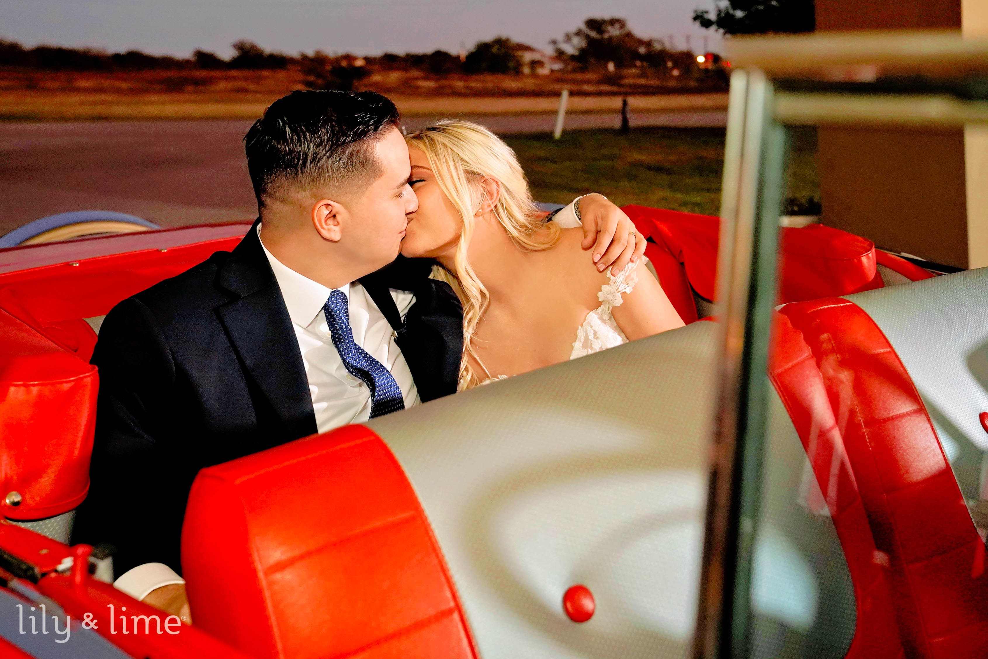 The celebration continued under an elegant indoor reception setting. The décor was one of minimal, romantic class, featuring pink and white table settings and soft ambient lighting. A magnificent three-tiered white wedding cake with a pink and green cascading design stood as a sweet centerpiece. As your Dallas Fort Worth wedding photographer, we focused on capturing all the key moments: the couple’s emotional first dance, the heartfelt toasts from loved ones, and the joyful cake-cutting. The night concluded with a magical sparkler exit, as Christian and Cassidy drove off in a vintage orange car, beginning their new life together. Their wedding was a unique and beautiful tapestry of personal details, deep love, and unforgettable moments.