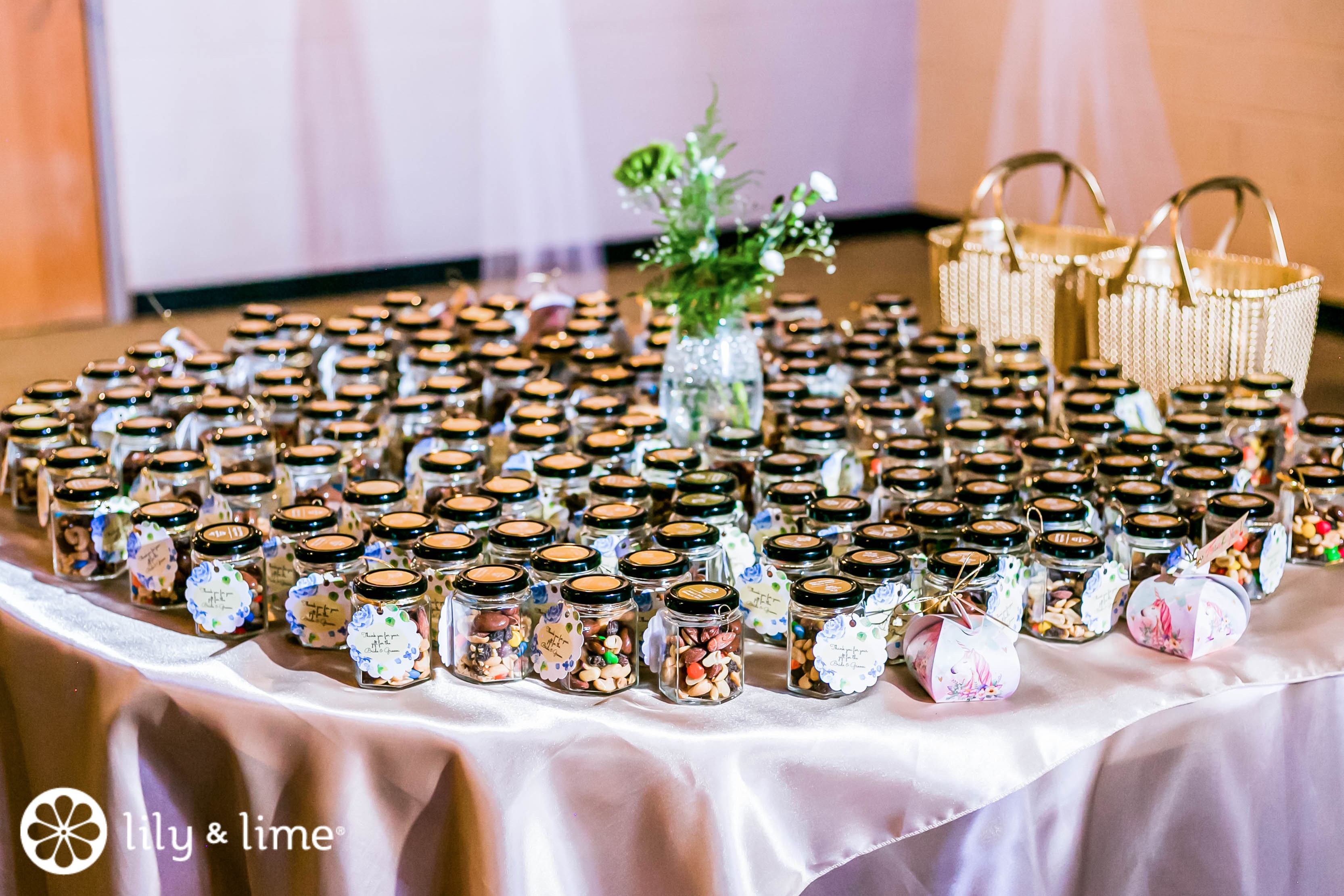 Fun fact: Everybody loves cookies! Or brownies and pies or any baked goods, for that matter! So incorporating baked goods into your wedding favor is something that you can never get wrong with. You can make it easy by batch-making a family recipe to your favorite baked goods, and packing them with a quirky note, or you can layer all the ingredients in a mason jar and print out the recipe in a card to sling around the jar. Everybody will like a treat to enjoy on the car ride home, and it will soothe the sweet carving just enough!