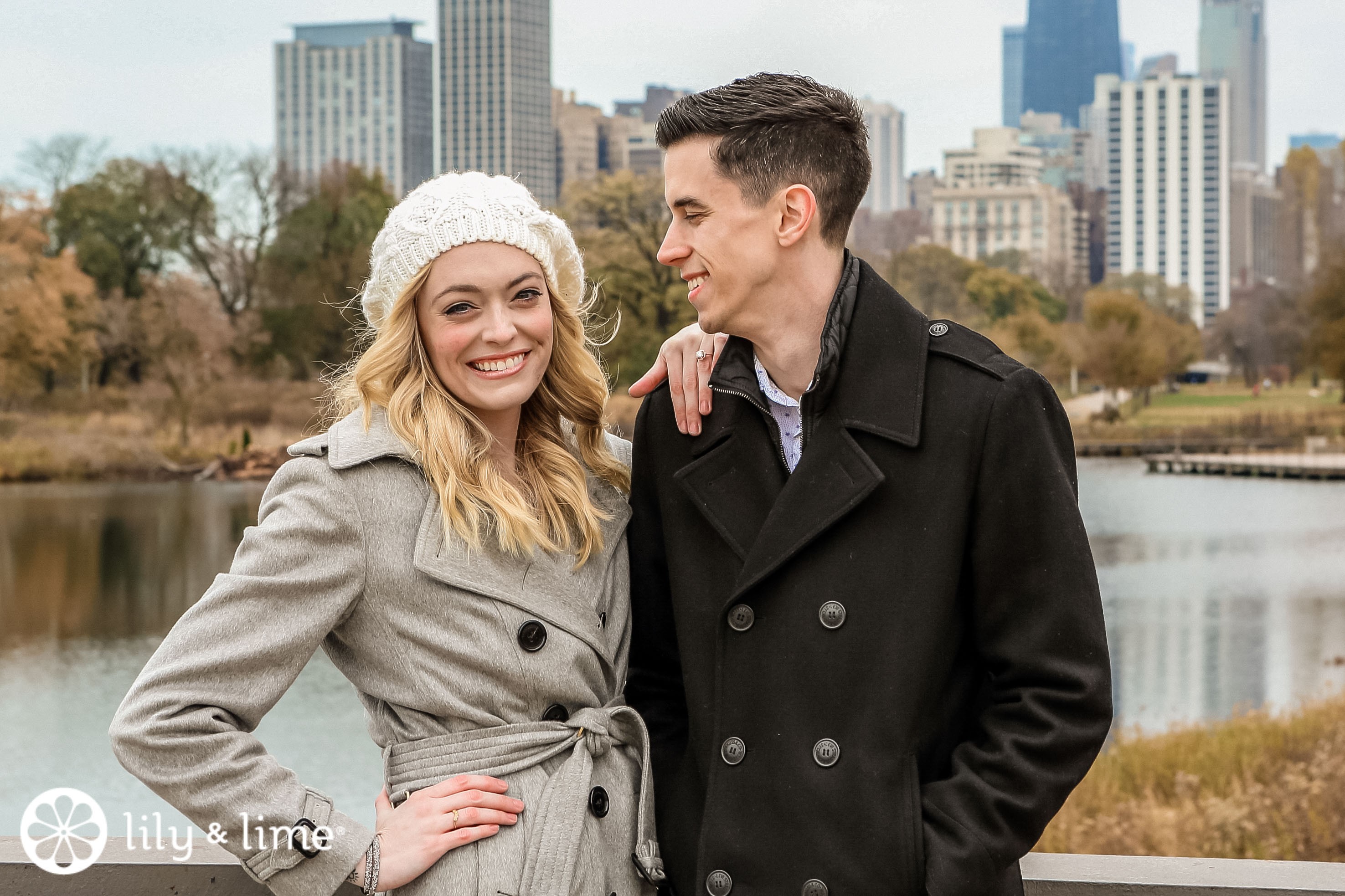 On the day of their engagement photo shoot, the air was crisp, chilling yet romantic. The entire environment was gracefully characterized to resonate with the romantic and excited moods of our Chicago engagement photographers when they met a lovely and adorable couple- Joseph and Jill for their engagement photoshoot! No doubt, they had such a blast taking these Lincoln Park Zoo engagement photos with the cute duo! Dressed up in co-ordinated winter wardrobes, Joseph and Jill were looking nothing but a stunner. Their smiles, the color combination of their clothes, and the entire setting was the sheer example of a romance in a winter wonderland! They were surely enjoying the park and its natural surroundings while posing in the comfort of each other’s arms. We love the picture where they are snuggled under the blanket against the trees that are in the natural renovation process. Ah, so romantic! And the couple portraits where Joseph is standing against the railing with his sweetheart on the grounds against the backdrop of the city's skyline and its skyscrapers! As if her sweet smile stole the thunder from the gleaming Chicago skyline! Our mood was lightened and lit with joy to see how wonderfully our affordable Chicago wedding photographers captured the pleasant and stunning views of the gleaming pond and towering trees wrapped with vibrant greenery and foliage just like a never-ending and beautiful dream!