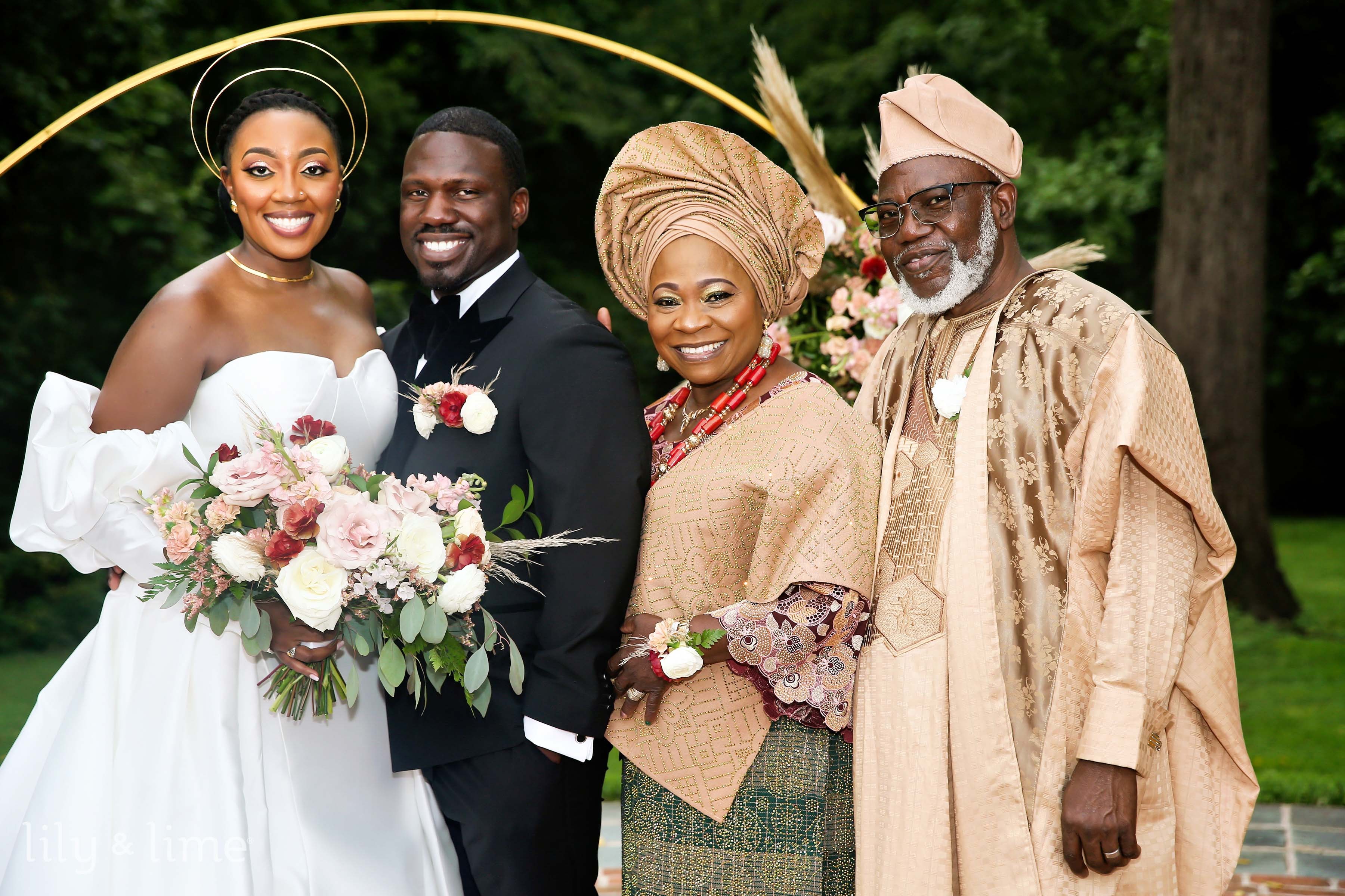 Kristi and Sheriff’s wedding day in Washington, D.C., was nothing short of magical. The day began with Kristi getting ready, surrounded by her closest friends and family. She stepped into her wedding dress, a crisp white masterpiece featuring a plunging neckline, fit and flare silhouette, pleated overskirt, and puffy sleeves. Her elegant bridal updo was adorned with a gold headpiece, and her gold jewelry added a touch of sophistication. She clutched a bouquet of white, pink, and orange flowers that complemented her radiant look—the perfect blend of timeless and modern.