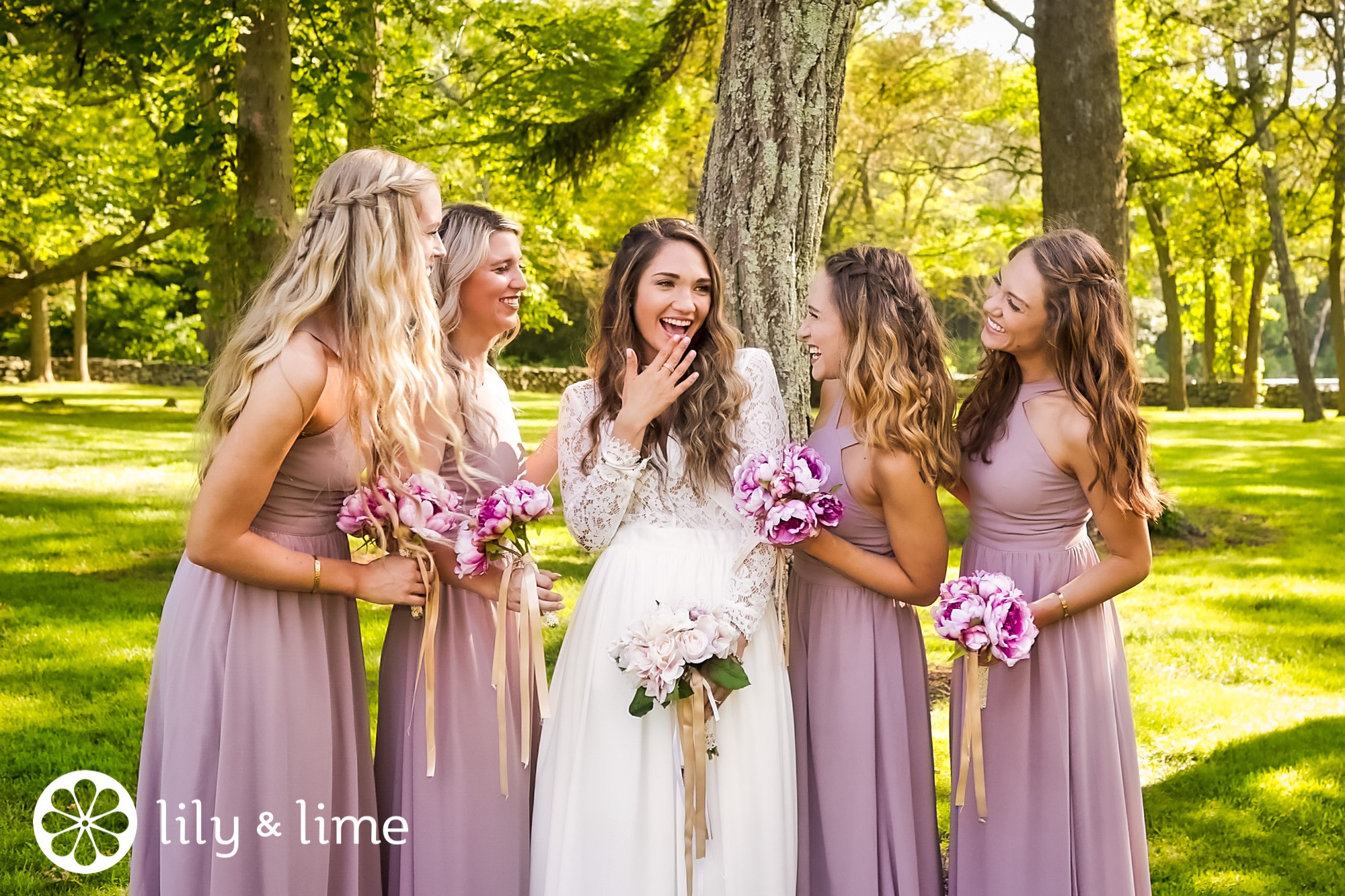 Bennett and his groomsmen wore blue suits with champagne colored ties and pocket squares, which matched the ribbon used to tie the women’s bouquets together. The bridesmaids donned dusty rose dresses. The overall look for the bridal party felt airy and chic, keeping everyone looking effortlessly comfortable.