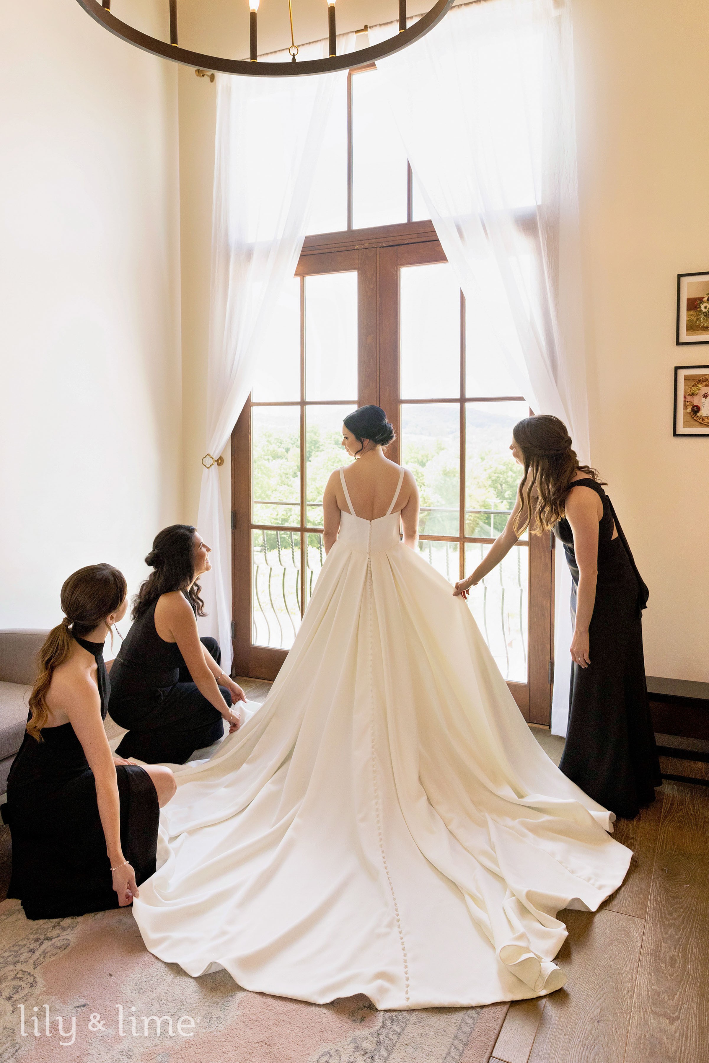Before the celebrations unfolded, photographers captured the wedding's exquisite details. Monochrome invitations, lush white floral elements with greenery, Marie’s stunning bridal gown, and her classic bouquet were all photographed with care, preserving every meaningful touch for years to come. The bridesmaids added a chic dimension to the day with black dresses in varying silhouettes, creating a perfect mismatched elegance that enhanced the wedding’s cohesive style. Similarly, the groomsmen wore matching black suits, their crisp white shirts and black bow ties harmonizing seamlessly with the formal theme.