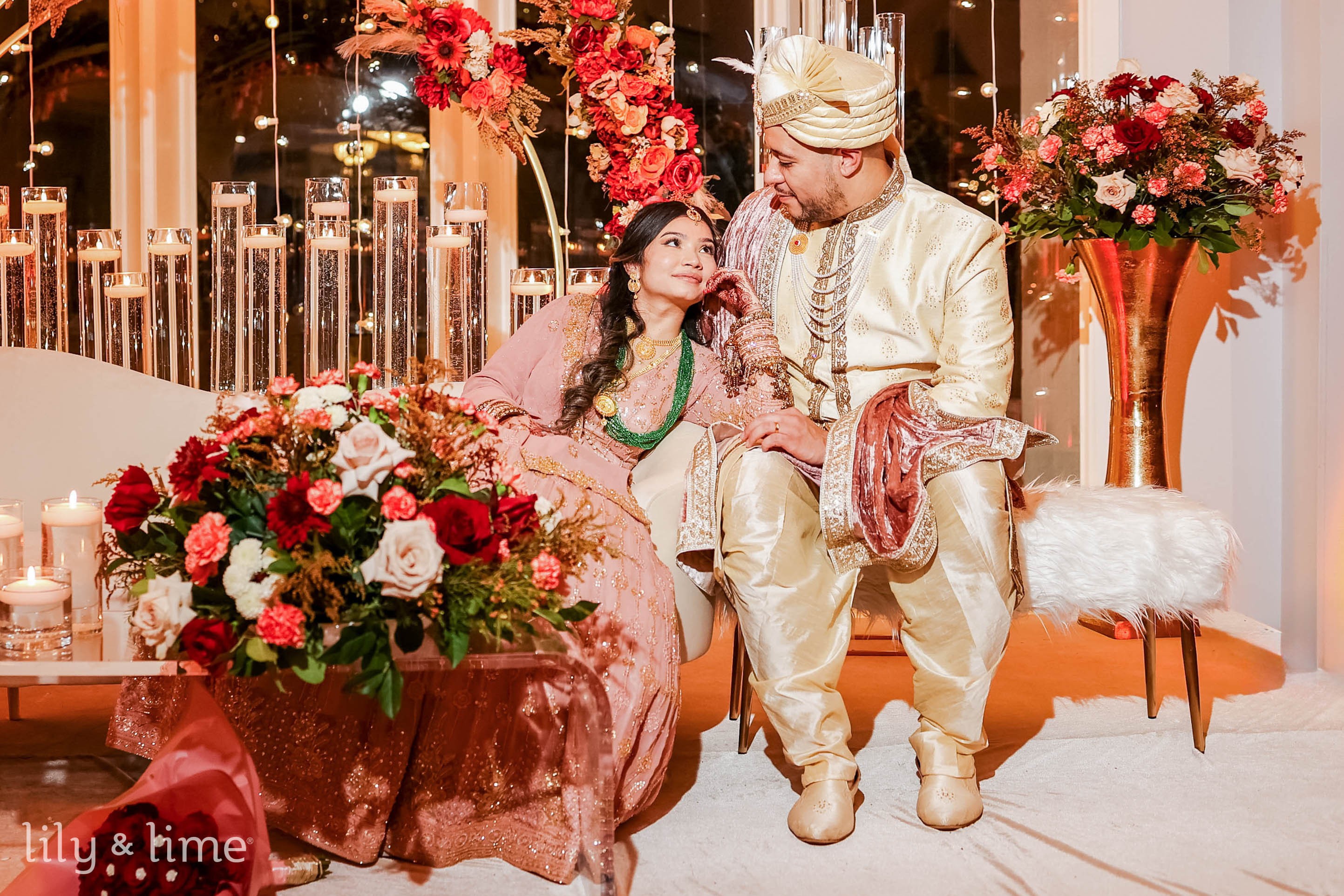Post-ceremony, the celebration continued at the same venue, now transformed for the wedding reception. The vibrant wedding decor featured bright flowers and beautiful wedding lights that illuminated the evening with a warm and festive glow. Pabi changed into a delicate powder pink lehenga, which perfectly balanced elegance and grace, while Gabriel opted for a different pair of golden sherwani, maintaining his regal demeanor.