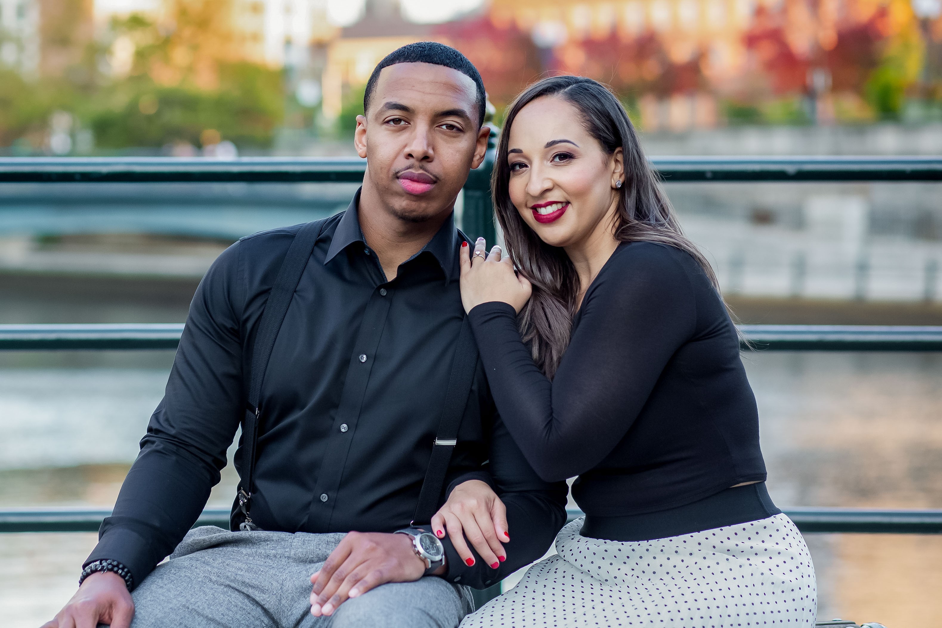 The fall season is indeed that time of the year when it is only about vibrant colors in the background. Beautiful and dynamic colors as the leaves everywhere start to change. Cute, cozy outfits when it is chilly outside, but not bitter cold! Therefore, couples need to make sure that they are choosing an outfit that will not only showcase their personality in the best way possible but will also look breathtaking in front of the camera lens! For an ideal fall engagement photography session, couples should cautiously choose their outfits as we don’t want the splendid and soul-calming colors that mother nature has to offer to clash with the clothes they pick for the engagement photoshoot! If you are looking out for some of the options that you can consider for your upcoming fall engagement portfolio, you can choose any color from dark to light! And our amazing and adorable couple, Rosa and Herbert just chose the all-time trending color. For her engagement photoshoot, Rosa wore a black round-neck skinny crop top and fashionably paired it with a chic black and white polka dot full midi skater skirt! She paired her complete glam and diva look with an open toe, thin ankle strap with high polish buckle closure, and pointed black heels. From head to toe, Rosa was looking nothing but sexy and magnificent! Rosa kept her wavy hair open and side-parted. A little tint of blush on her rosy cheeks and that power red lipstick made her overall look stunning and breathtaking! As it was an engagement photography session, how can we forget her ring? The single studded diamond ring on her beautiful finger (we must say her nails were beautifully manicured!) just looked perfect! Her nails painted with cherry red nail paint said a lot about her! Her complete attire did reflect that Rosa was fierce, confident, but indeed a romantic woman, who is head over heels in love with her sweetheart- Herbert! While Rosa was looking out of the ordinary, Herbert looked like the man of every girl’s dream!
