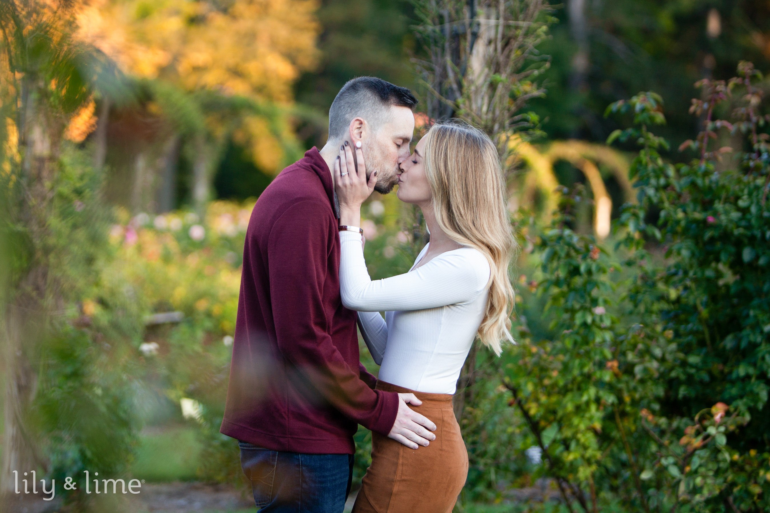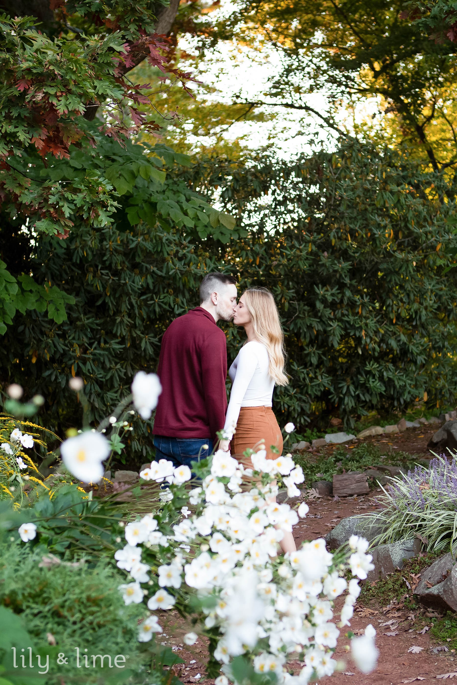Our photographer was happy with the choice of the photo session location since it was the perfect time! During this outdoor fall photo session, our photographer knew that the warm hues, the flowering plants here, the blooms, and the creeper-covered gazebos were the perfect backdrop for beautiful photos. To make the most of their outdoor photo shoot our couple decided to dress up in beautiful fall-inspired outfits. Their engagement photo session outfits were casual and fit the season perfectly. For the day, Lindsay decided to put on a rusty orange skirt and paired it with a lovely ribbed white sweater. To finish her outfit, she put on tan boots. For her day’s look, she kept her makeup for the day natural and soft. Her hairstyle for the day was naturally swept. To match the beautiful fall aesthetic for his finances, Timothy put on a maroon sweater, and blue shirt with a blue pair of jeans. He paired his outfit with a stylish pair of gray shoes. For the beautiful engagement photo session, our couple for the day was dressed in stylish fall-inspired outfits and our Hartford engagement photographer was excited to get the day started. The stunning surroundings, colored with yellows, oranges, and greens were just right for the photo session for the day!