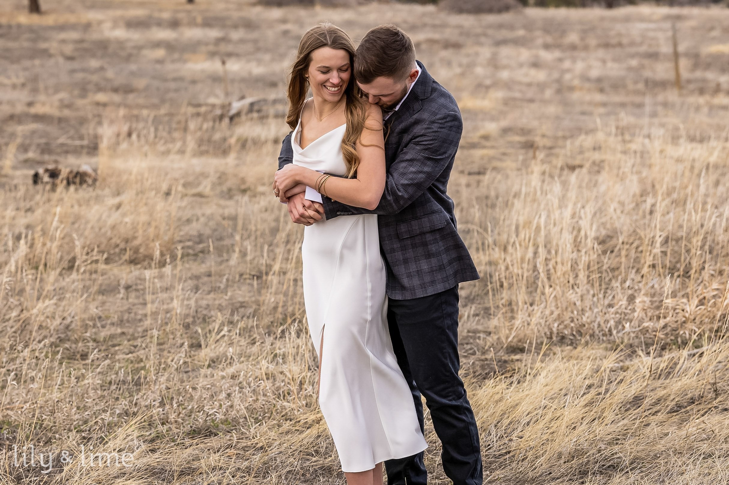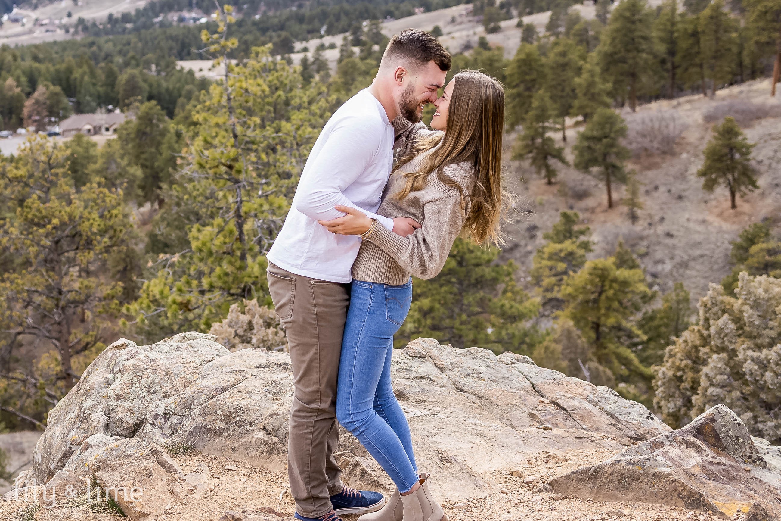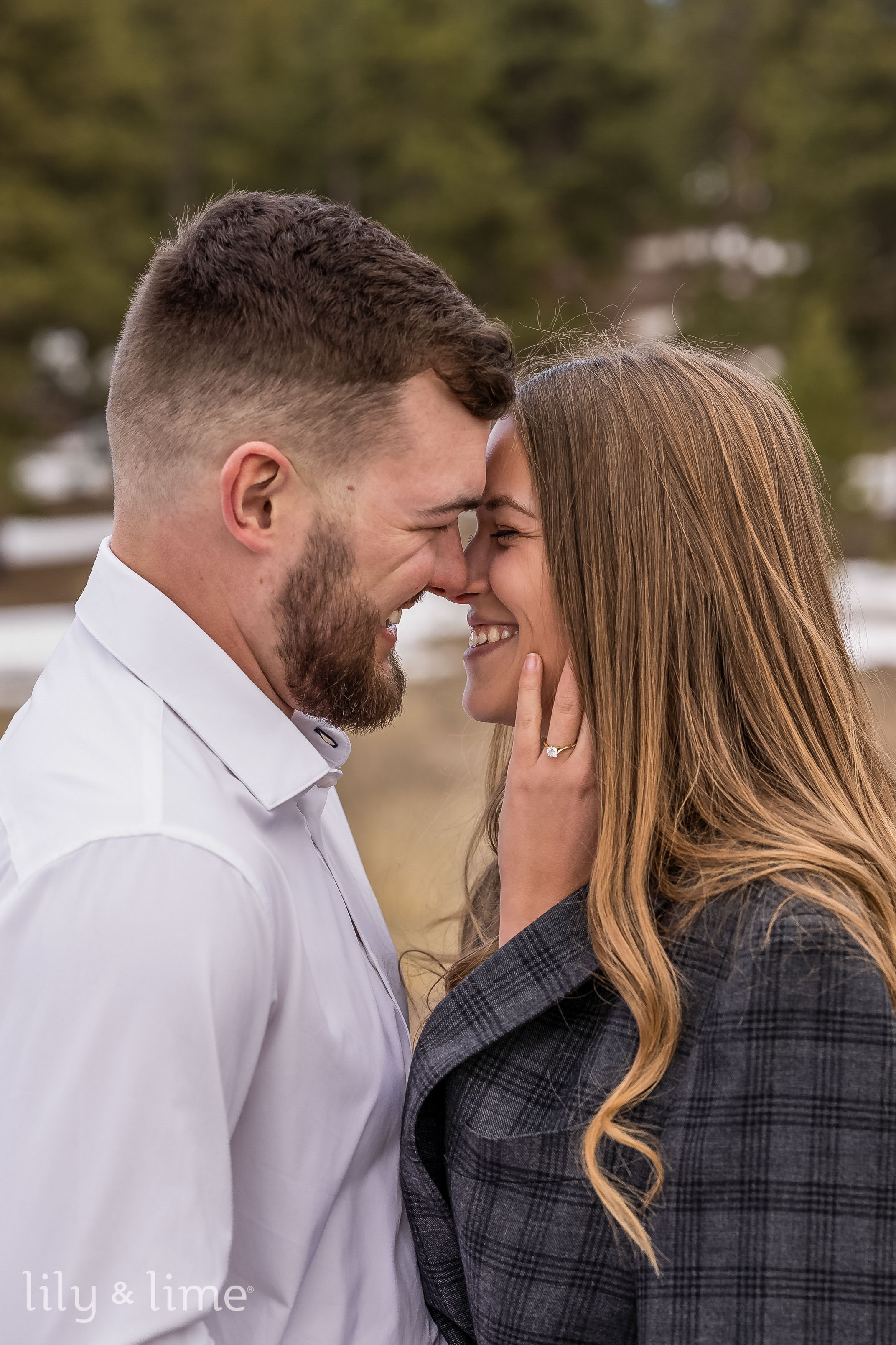 Our hearts were swooned by the detailed shots as Taylor and Matthew flashed their engagement rings. Without missing out on a single photo opportunity, they ventured through the quintessential areas of this couple’s photo location in Denver, while creating sun-kissed couple engagement portraits. Whether it was the breathtaking couple pose in the rustic grasslands or the silhouette of the lovestruck duo kissing against the towering trees marked with freshly fallen snow, every detailed shot looked brilliantly amazing for creating a memorable engagement photo album. There was something so mesmerizing about this Denver newly engaged couple, and probably it was their charming laughter or the way they looked at each other that told a million love stories without saying a single word.