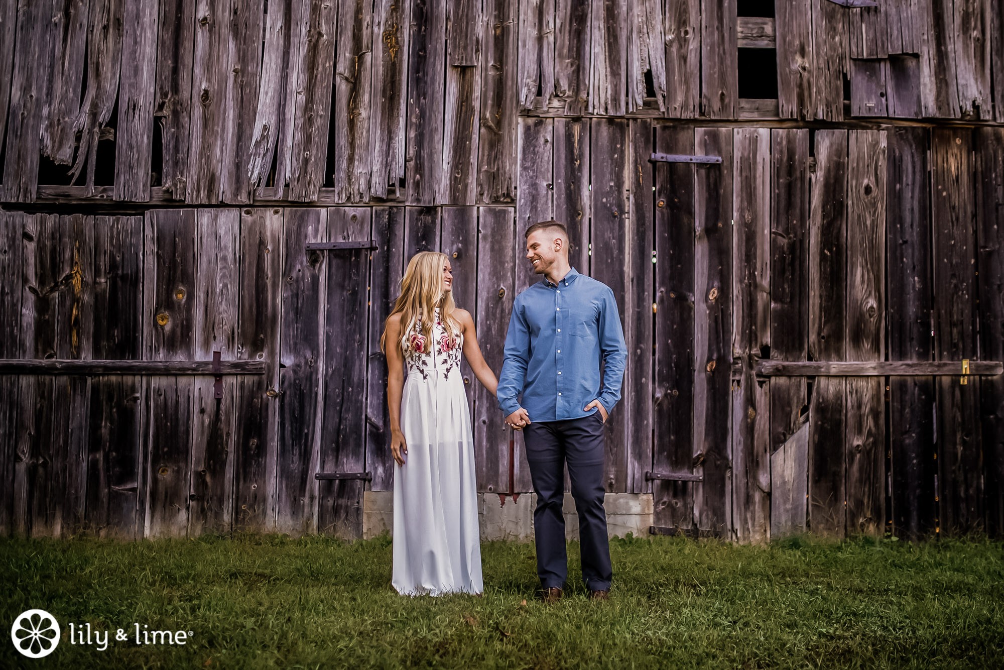 We can’t stop raving about the beautifully minimal but rustic photos. Our favorite? The photos in front of the weather-worn wood exterior. There’s something about couples being photographed in the laps of natural wreck! Their Kansas City engagement photographer captured the duo in the little perfect nooks. The sunlight pouring in through the trees made them iridescent and added dimension to the photographs.
