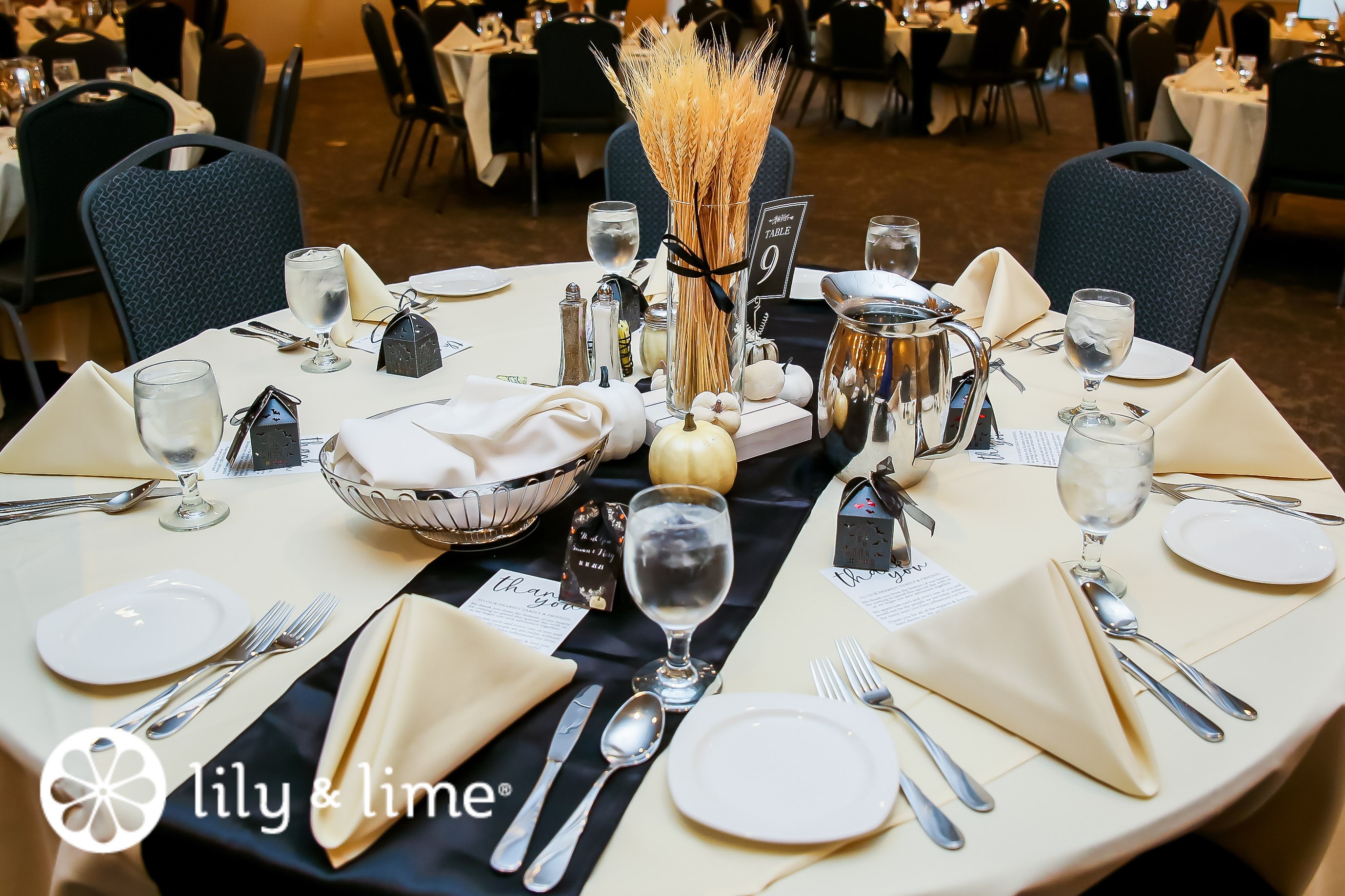 Another pumpkin-themed wedding idea - you can dip mini pumpkins in shimmering gold glitter or opt for artificial ones to create elegant place card holders. Guests can take these to their homes as charming seasonal wedding favors and incorporate them into their holiday décor.