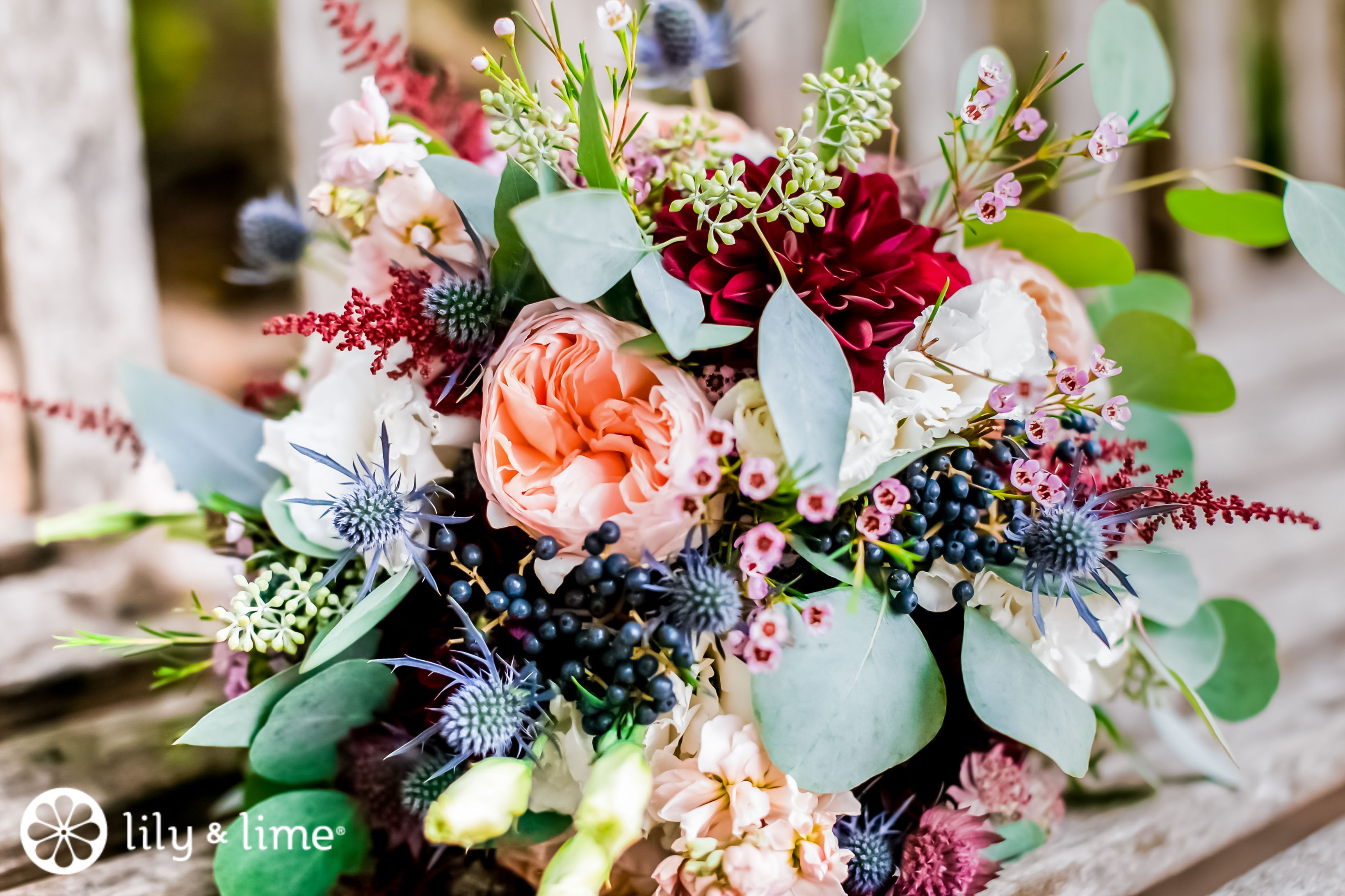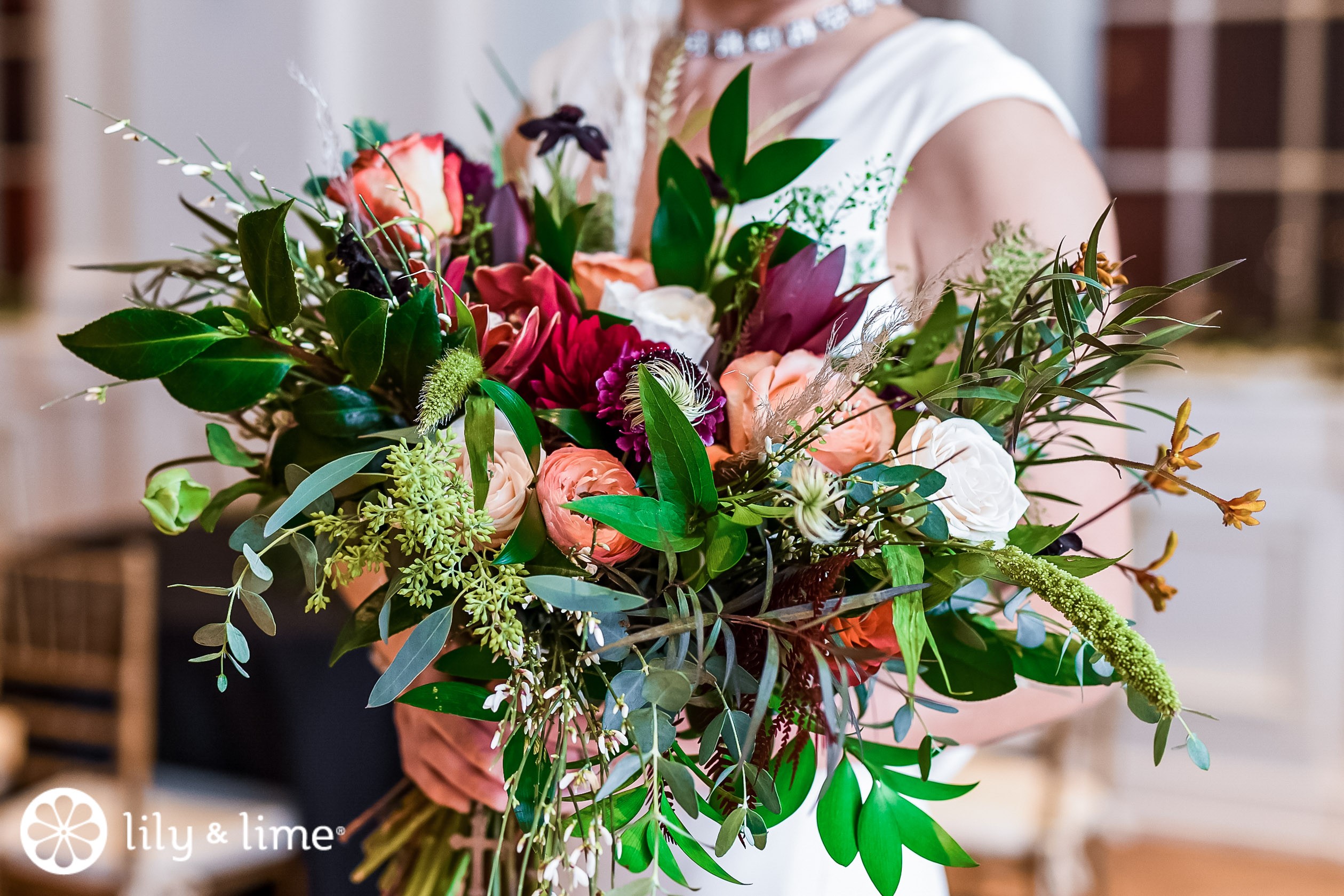 For fall brides and brides who want to include bold colors in the wedding, dried flower ensembles are quite popular. From neutral color palettes with modern and rustic flairs like a bunch of lavender and thistle to bouquets made out of small daisies and grasses as a minimalist bouquet idea, dried flowers are one of the big upcoming wedding trends. Dried blooms like bridal bouquets made out of creamy astilbes, pinecones, berries, and pale millet have a super-soft textural warmth that gives a charming finish to a rustic arrangement. You can add a mix of your own bunch of dried stems and flowers as well as greenery to these rustic bridal bouquets and create a fall vibe to a romantic flower arrangement. From a wheat wedding bouquet with creamy roses and some lavender to an ensemble featuring dried herbs, feathers, and blue blooms, there are so many creative spins to this rustic wedding flower trend. Even decorative pine cones fit winter and fall weddings and are more cost-effective than other wedding flowers and look just as nice.