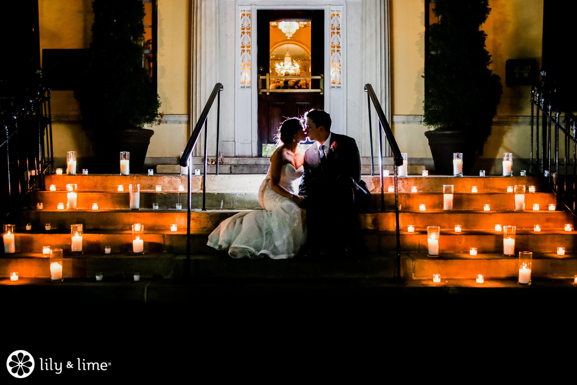 You can decorate your venue stairs with candles along the edge of each step. If the staircase won’t be used, you can line the candles along the full width of each of the stairs, making a grand statement. Another approach to candles in ceremony decor is to line the aisle with candle lanterns.