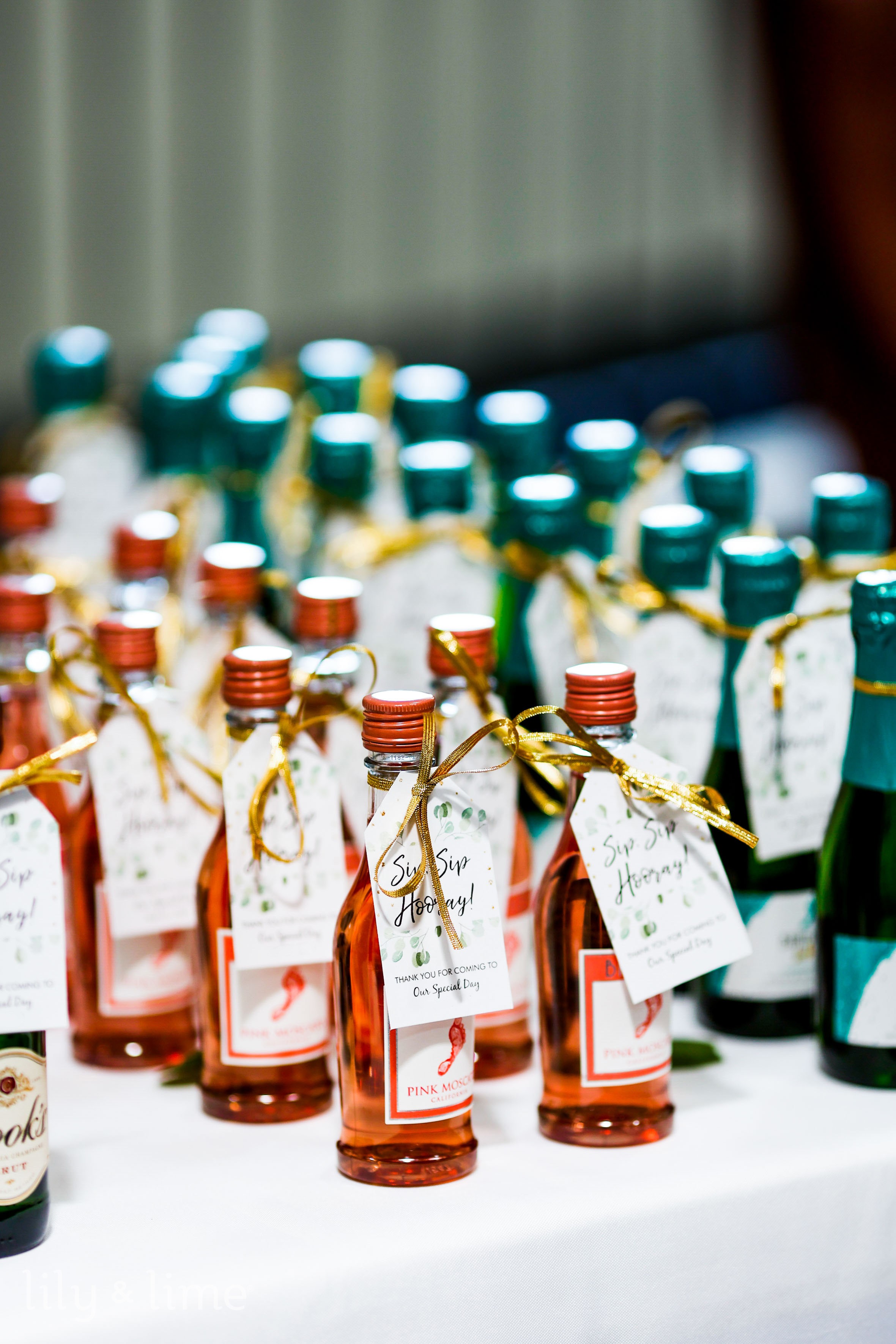 Miniature Bottles: Miniature bottles of wine, champagne, or spirits are a chic and sophisticated choice for wedding favors. Couples can personalize the labels with their names and wedding dates, adding a touch of elegance to the table settings.