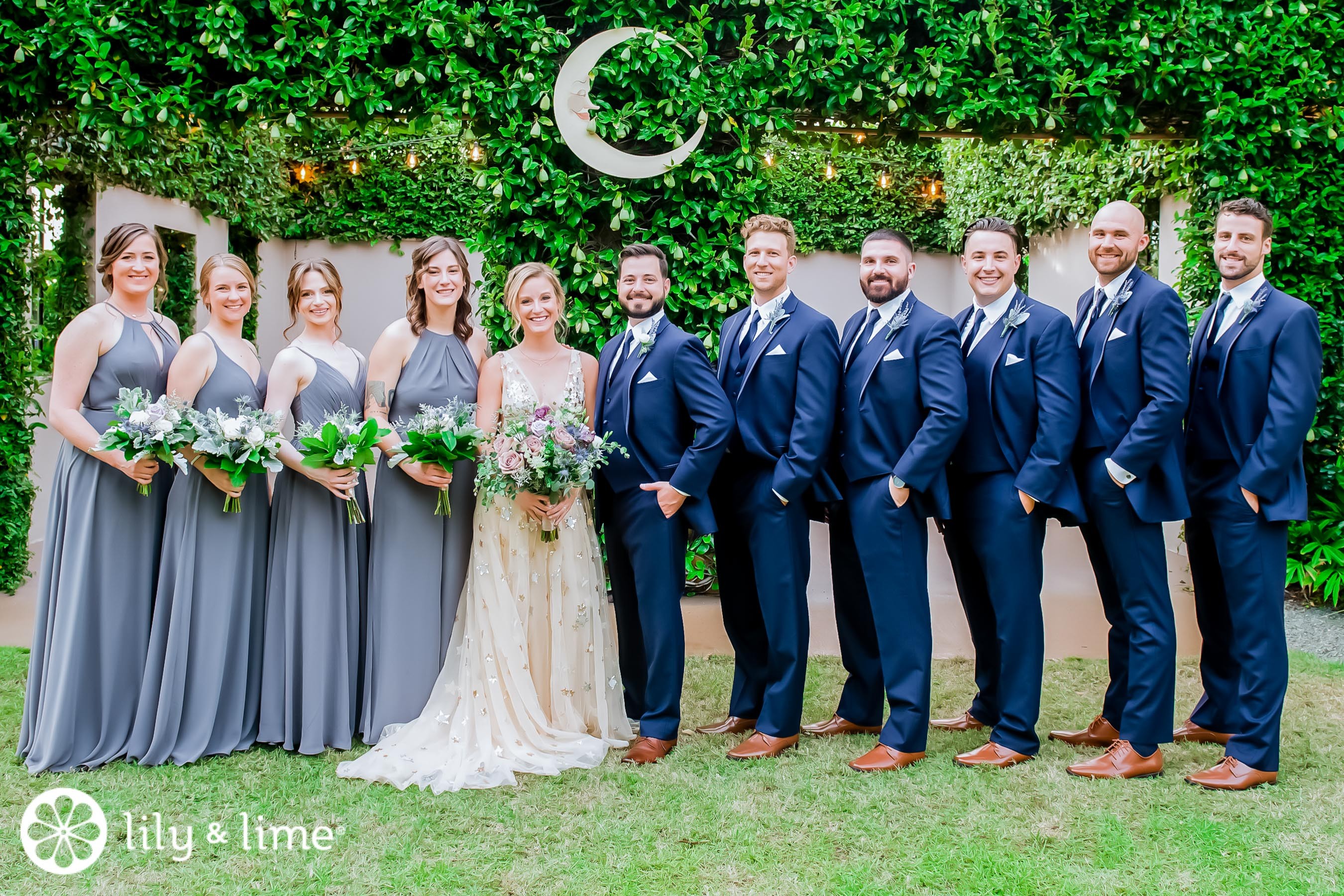 When the wedding day arrived, the venue was dressed in the theme colors that the couple had chosen. Months of wedding planning had gone into creating the perfect vibe for the two to tie the knot in. The couple wanted to create a wedding set-up that they not only loved but also associated with, hence the greenery-laden wedding venue was dressed in pretty blue and white, mimicking the delicate colors of a night sky peppered with stars. A crescent moon wedding decor prop was added to the outdoor altar, where the couple tied the knot. As the wedding ceremony approached, the couple decided to get dressed for the day ahead of them, separately. The excitement for the upcoming wedding events was easy to see when Sloane and Kel were getting ready. Their getting ready photos show the excitement the couple felt clearly. Before getting dressed for the day, Kel was dressed in an orange Hawaiian shirt with tropical details and shorts. Before getting dressed, he looked over the list of the events for the day the couple had planned and smiled thinking back on their memories of planning the wedding. His smile seemed to say, “The day is finally here.” He had picked out a dazzling blue wedding suit, matching the celestial theme of their wedding. Dressing up in a deep blue wedding tuxedo, he completed his wedding look with a white flower boutonniere and a white pocket square. The groomsmen were dressed in a similar shade as well, matching the groom. The groom and groomsmen even had similar shoes to match each other’s style!